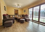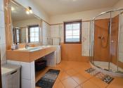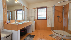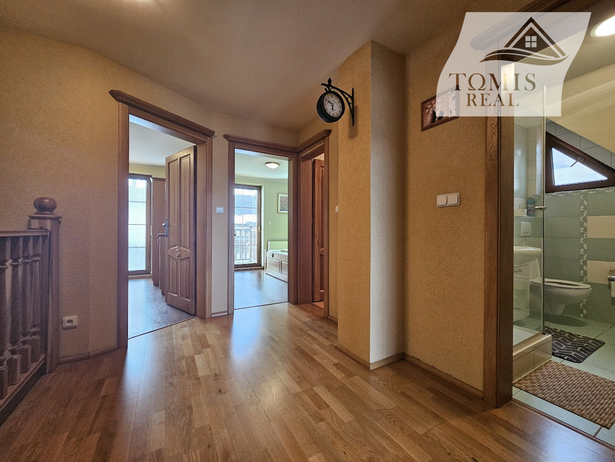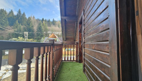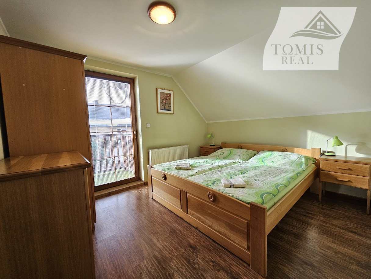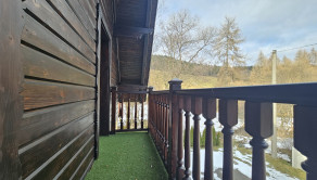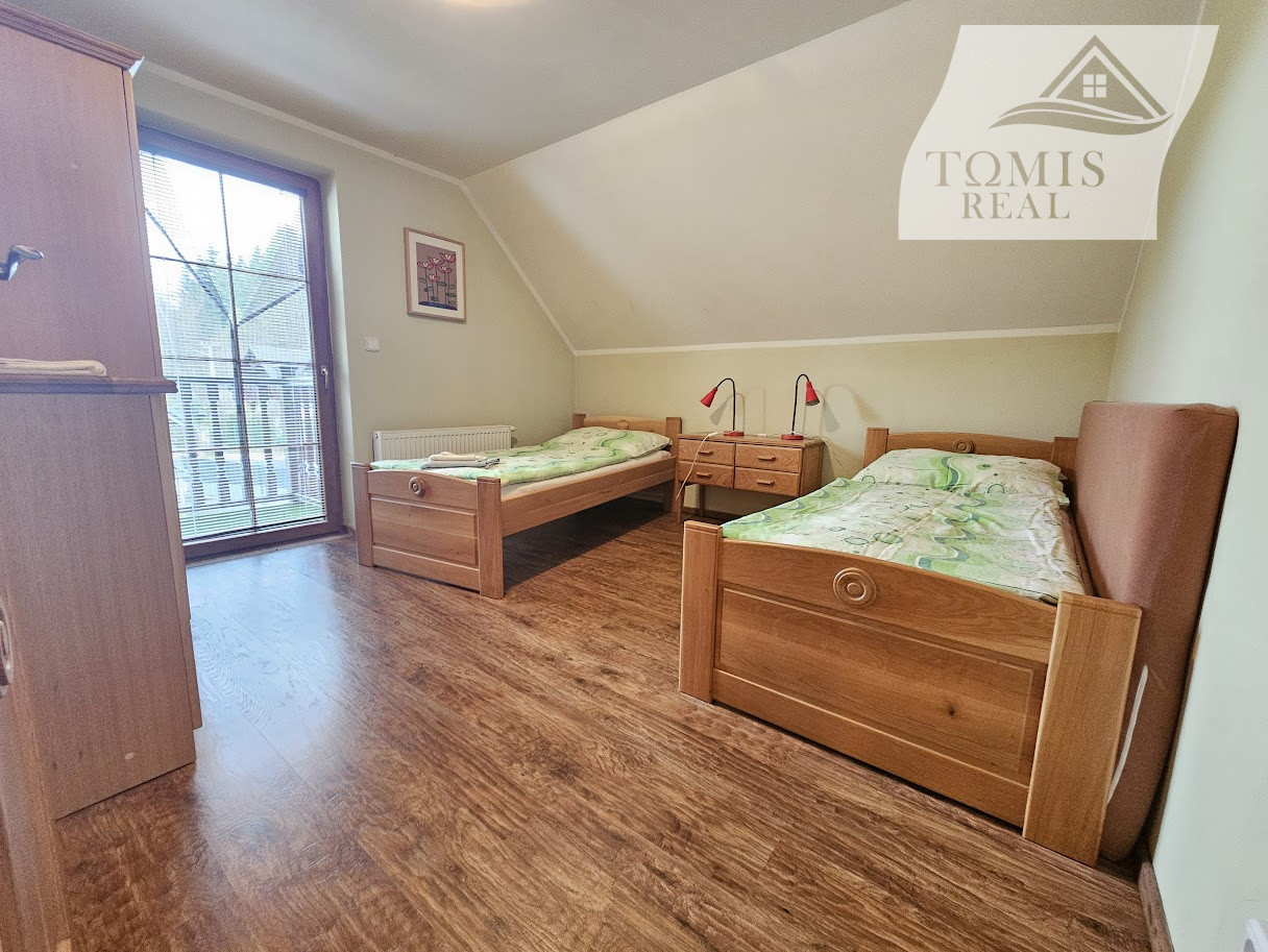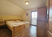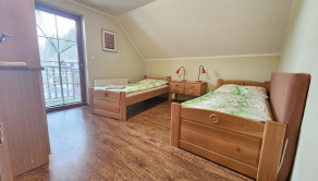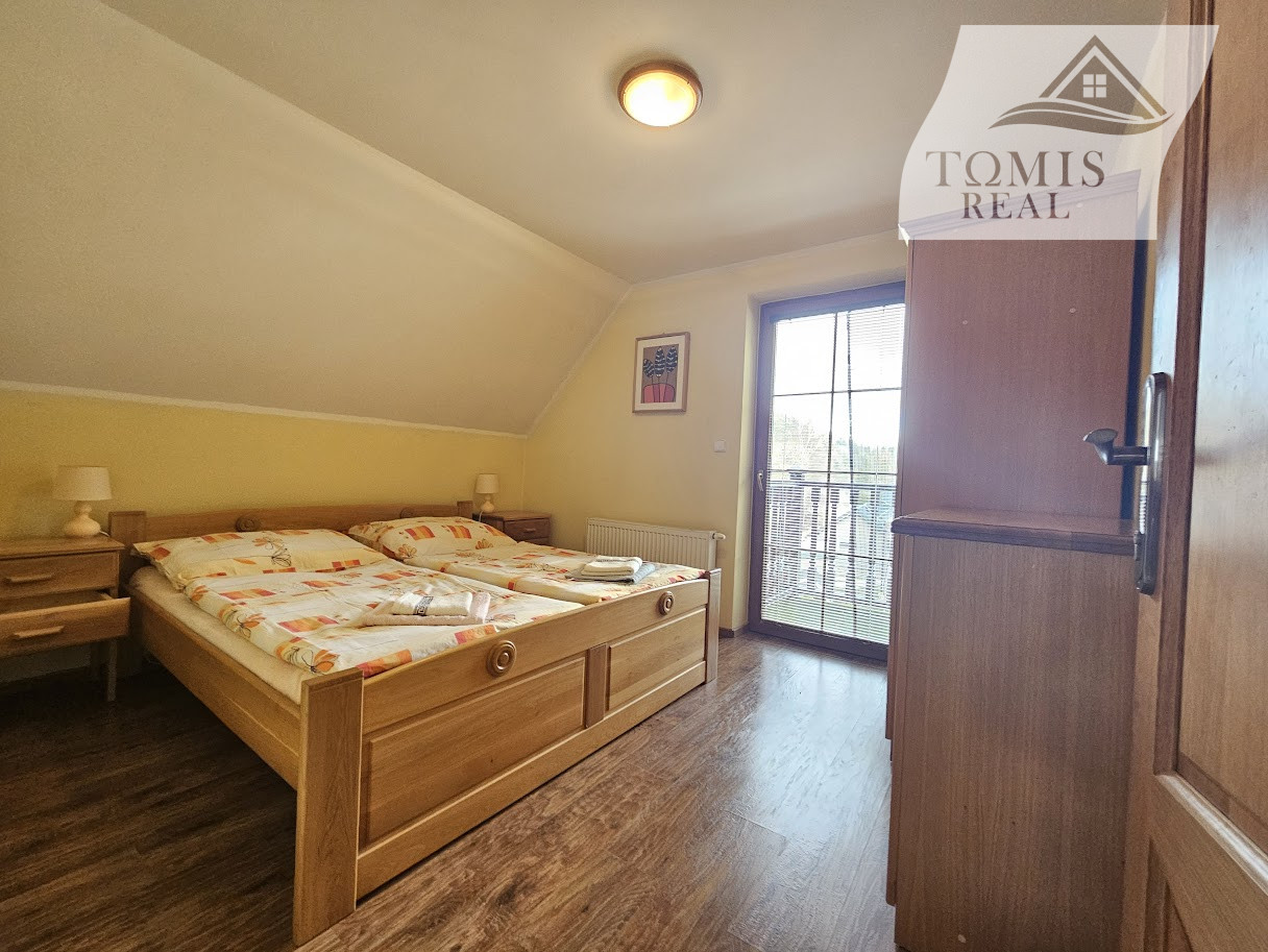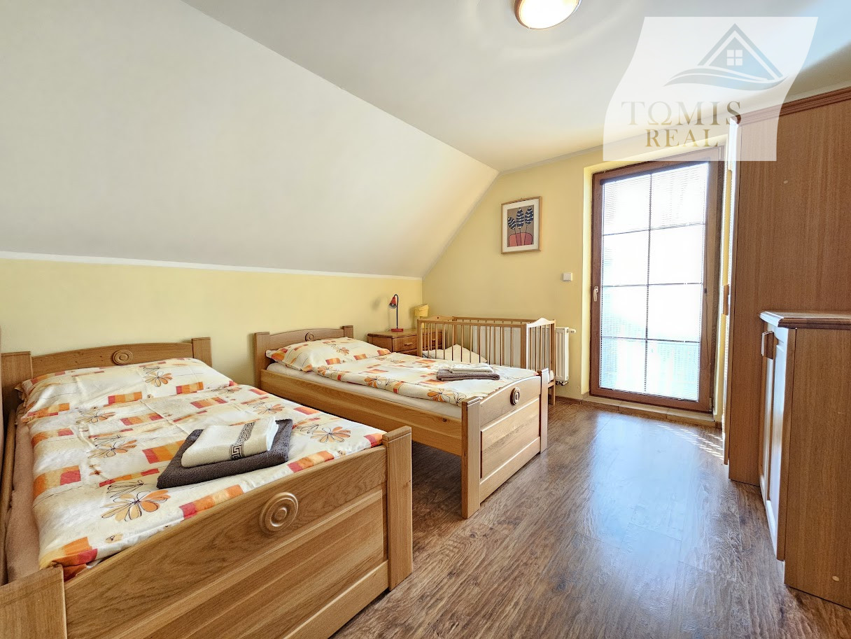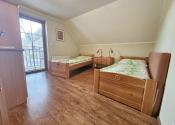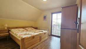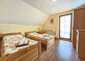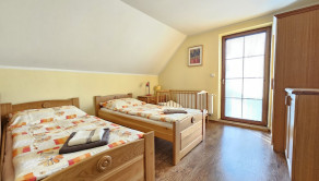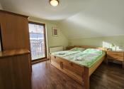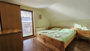 poschodie - dve izby s manželskou posteľou, dve izby s oddelenými posteľami a 1 detskou postieľkou, dve kúpeľne s dvoma wc. Z každej izby je vstup na balkón.