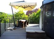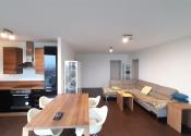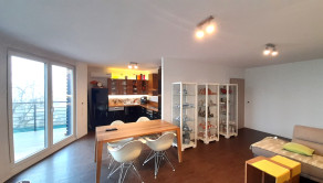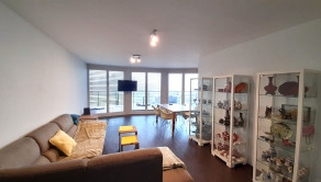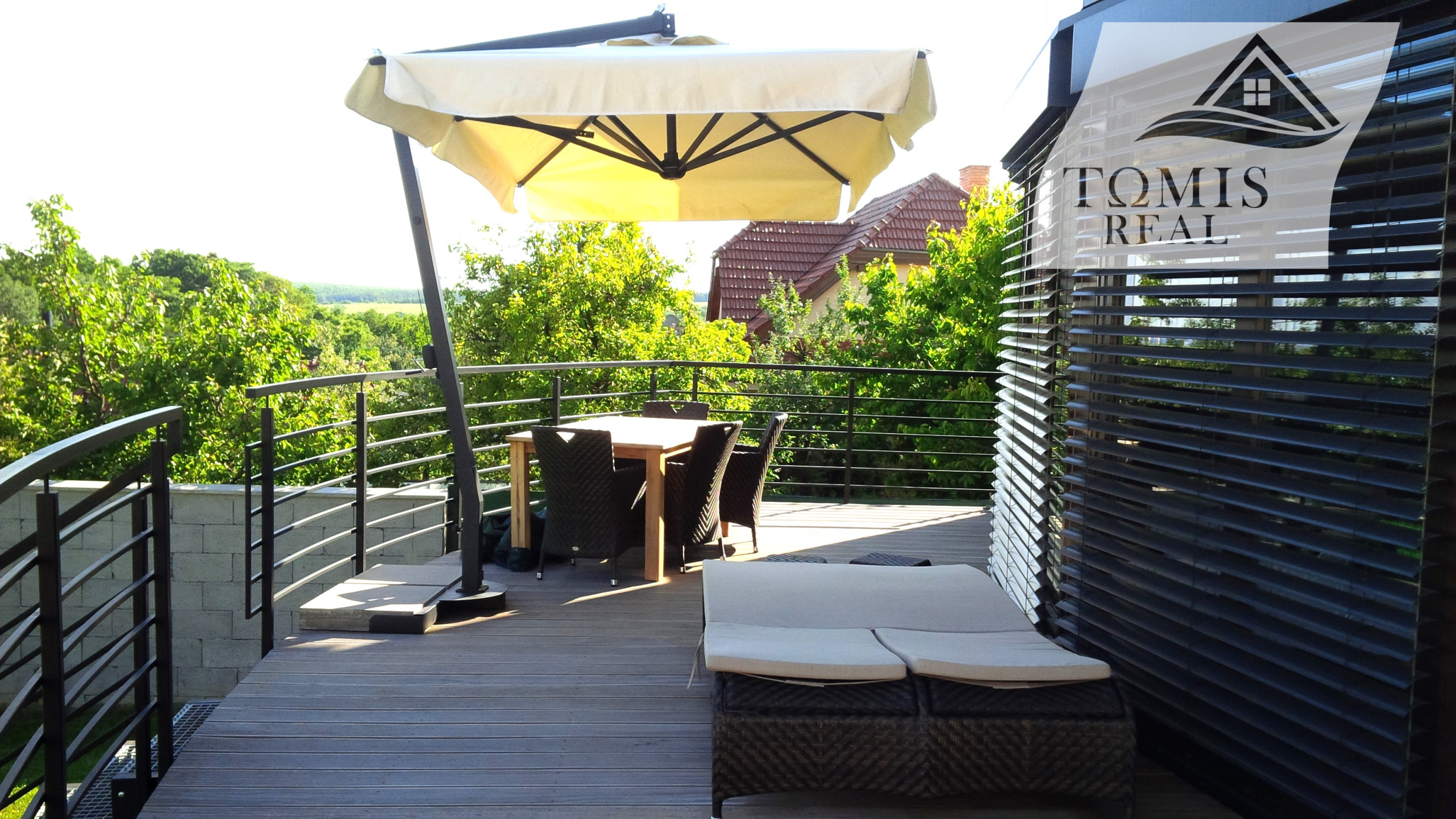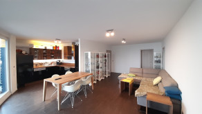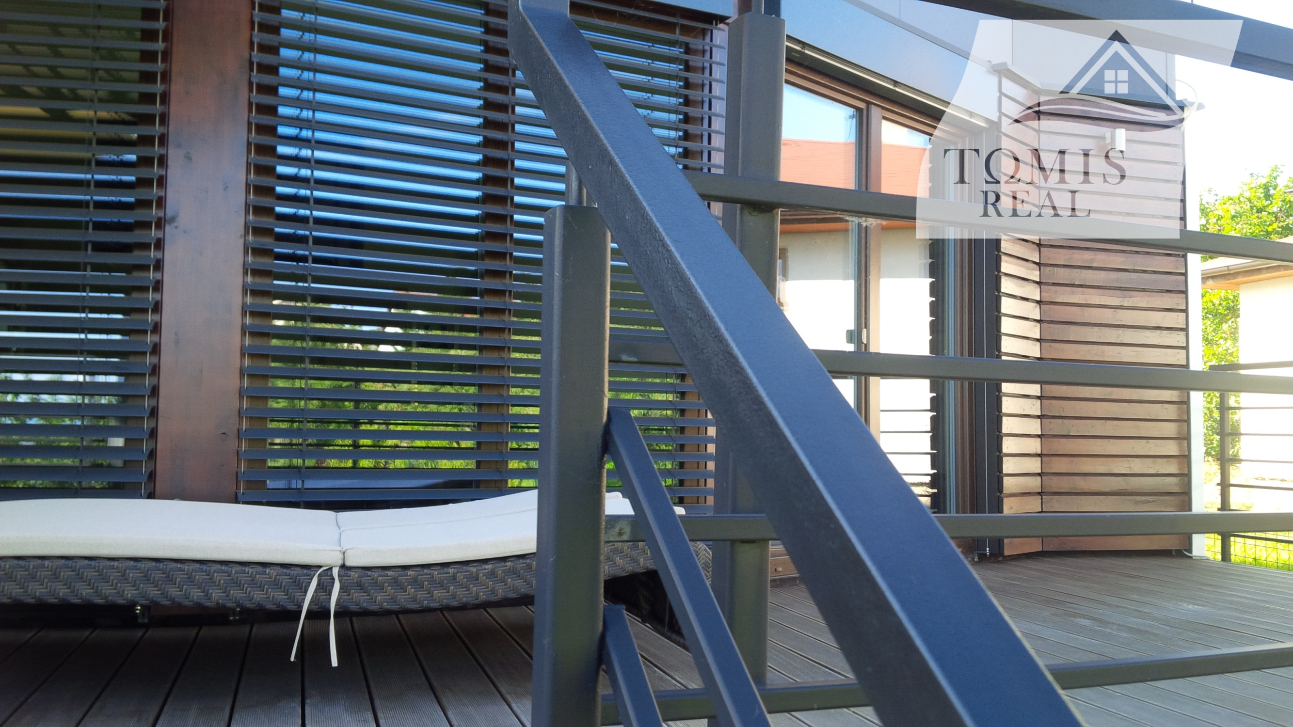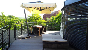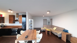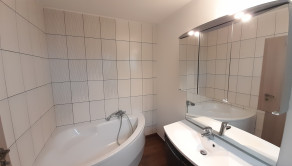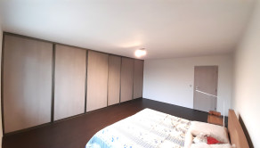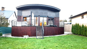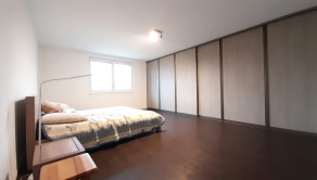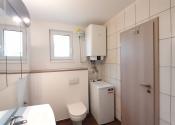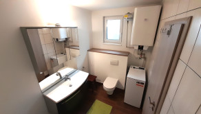 Z obývačky je cez francúzske okná výhľad na záhradu a výstup na podsvietenú terasu odkiaľ sa schodiskom dostanete priamo do záhrady. Kuchynská linka je samozrejme na mieru, podlahy obytnej časti tvorí keramická dlažba a vinyl, v celom dome je elektrické podlahové kúrenie s termostatom v každej obytnej miestnosti.